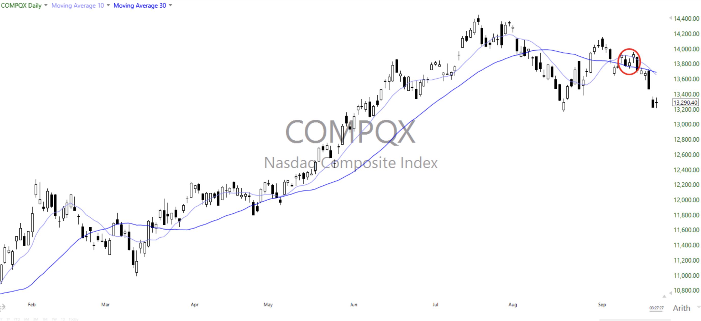 Ora, diamo un’altra occhiata al grafico del NASDAQ, che mostra un consolidamento (contrazione della volatilità) seduto proprio su un ovvio supporto delle medie mobili.
