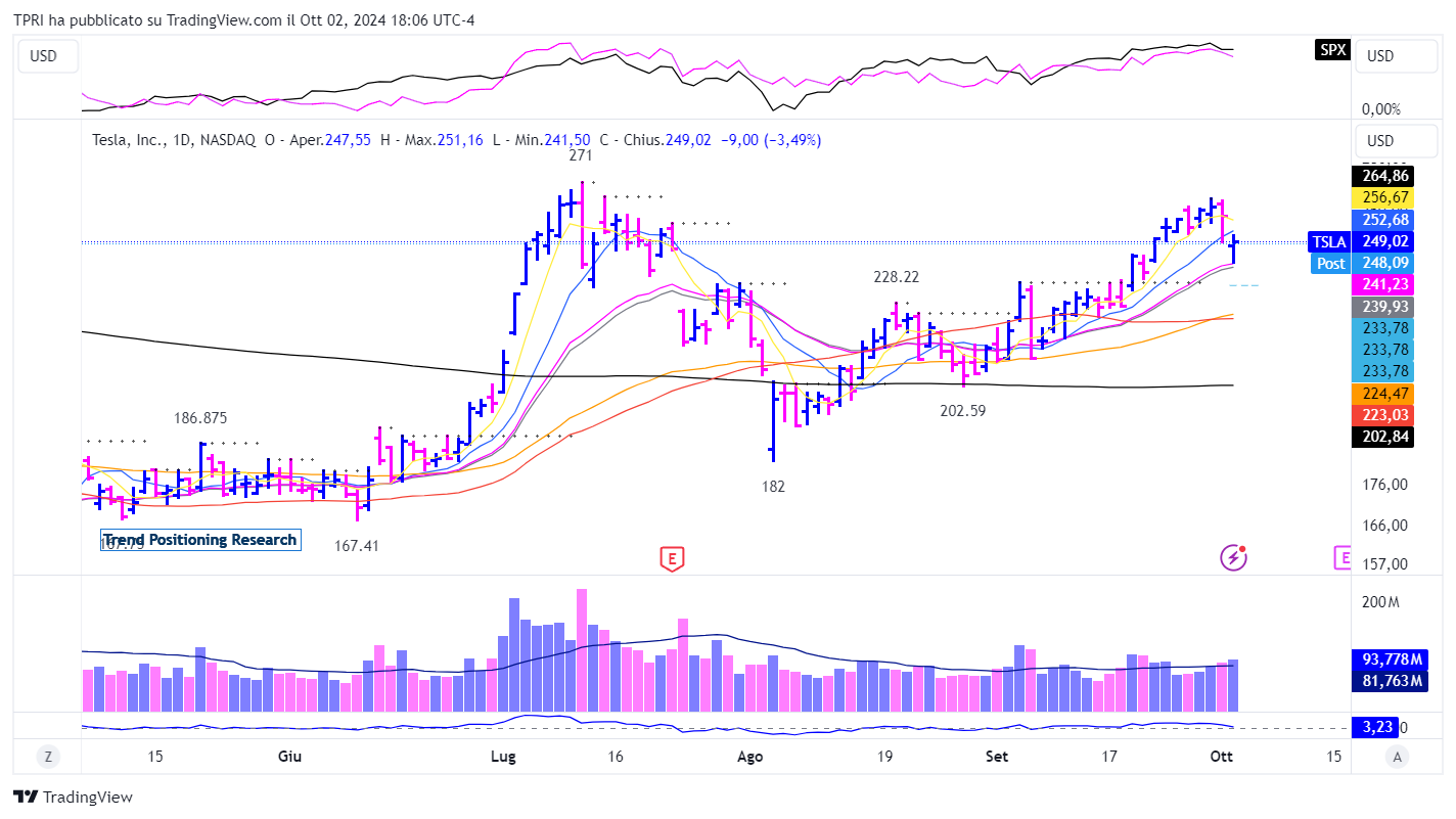 Tesla (TSLA) ha registrato un calo del 3,49%% dopo aver annunciato le consegne del terzo trimestre ieri. Il colosso ha prodotto 469.796 veicoli e ne ha consegnati 462.890, con un incremento del 6,4%.
