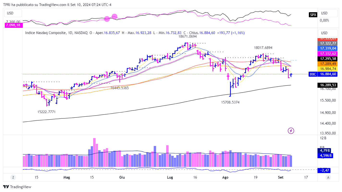 Come mostra il grafico, il rimbalzo di ieri è stato un classico “inside day”. Questo significa che i massimi e i minimi della sessione sono stati entrambi compresi tra i massimi e i minimi di venerdì. Quindi, sebbene il guadagno di lunedì sia stato discreto, non recupera affatto la brutta discesa dell’indice, iniziata dopo il tentativo fallito di superare il livello di 18.000 durante il rally di agosto.