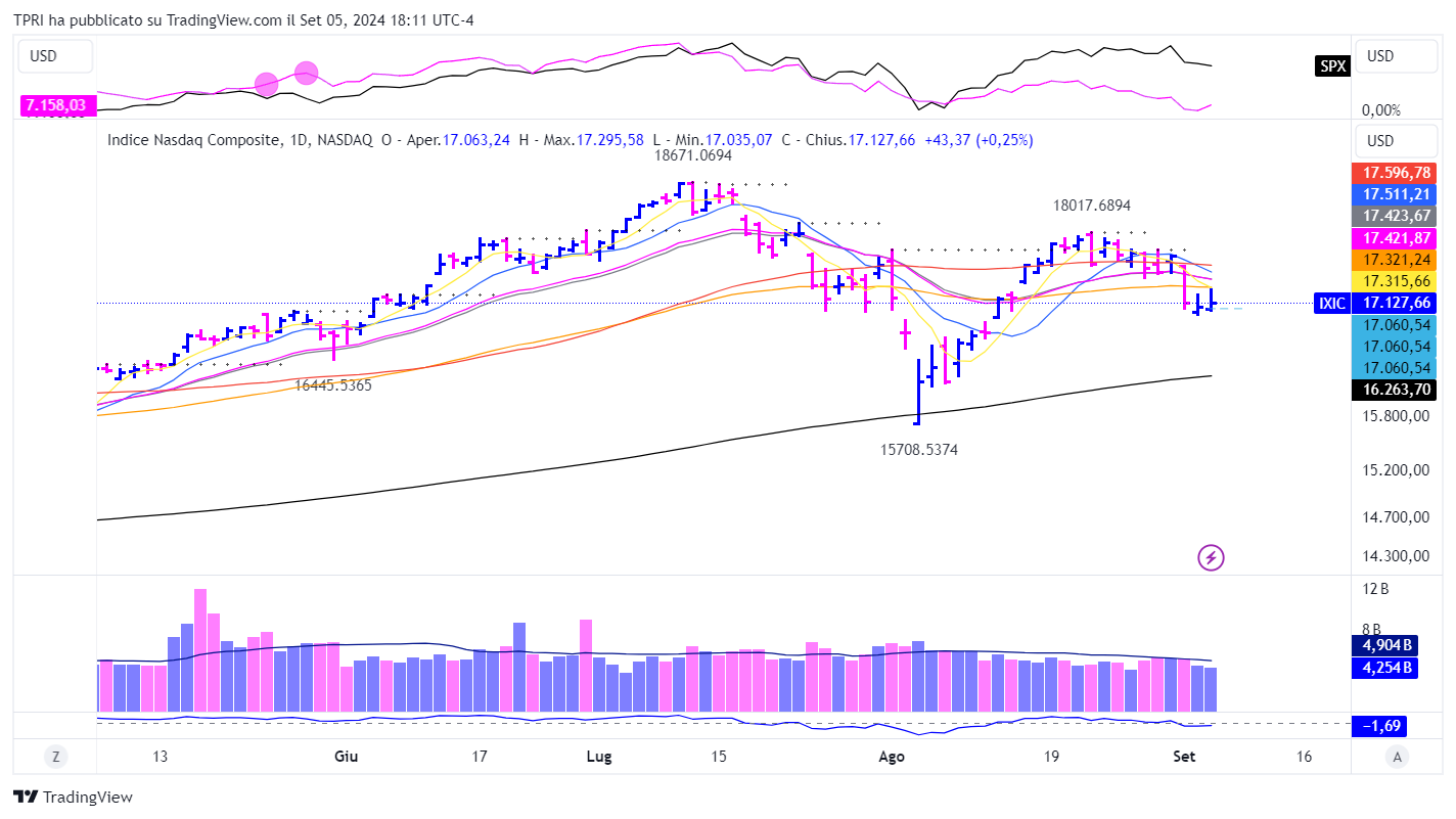 Il Nasdaq, inizialmente in rialzo dell’1,2%, ha chiuso con un guadagno dello 0,25%, al di sotto delle sue medie a 21 e 50 giorni. L’indice tecnologico ha mantenuto il livello dei 17.000 punti e rimane sopra il minimo del 13 agosto.