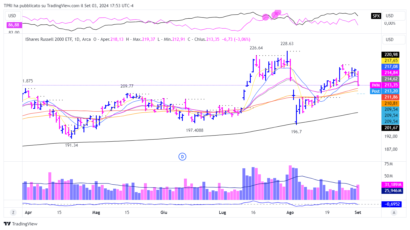 Invece, è accaduto l’opposto. Il Nasdaq, che è stato in ritardo per settimane, ha guidato il ribasso di ieri. Ora si trova al di sotto del massimo raggiunto nel giorno del position day del 13 agosto. Una chiusura sotto il minimo sarebbe un segnale ancora più ribassista.