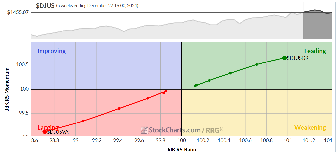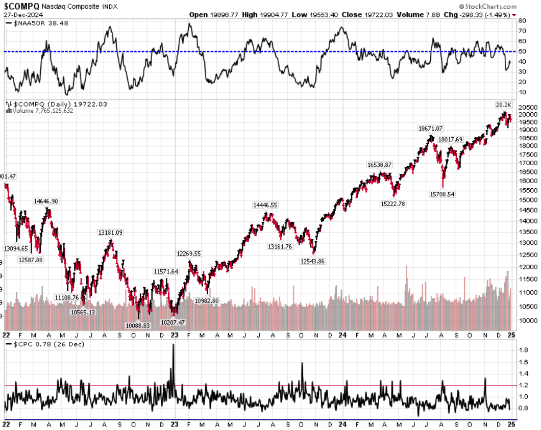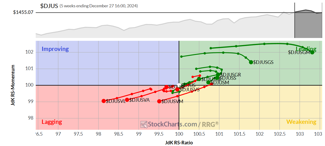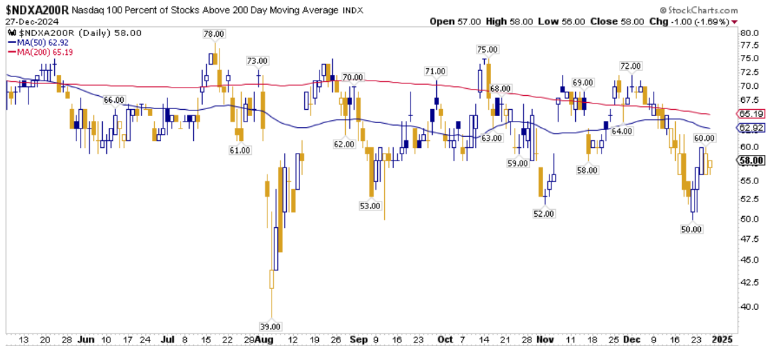 Il Dow Jones è stato il migliore tra i principali indici venerdì, con una perdita dello 0,8%. Nonostante un lieve incremento settimanale, l’indice resta in calo del 4,3% per il mese di dicembre e si mantiene al di sotto della media mobile a 10 settimane. Tra le peggiori performance all’interno dell’indice si segnalano i titoli del Big Tech, tra cui Nvidia (NVDA), Microsoft (MSFT), Amazon (AMZN) e Apple (AAPL).