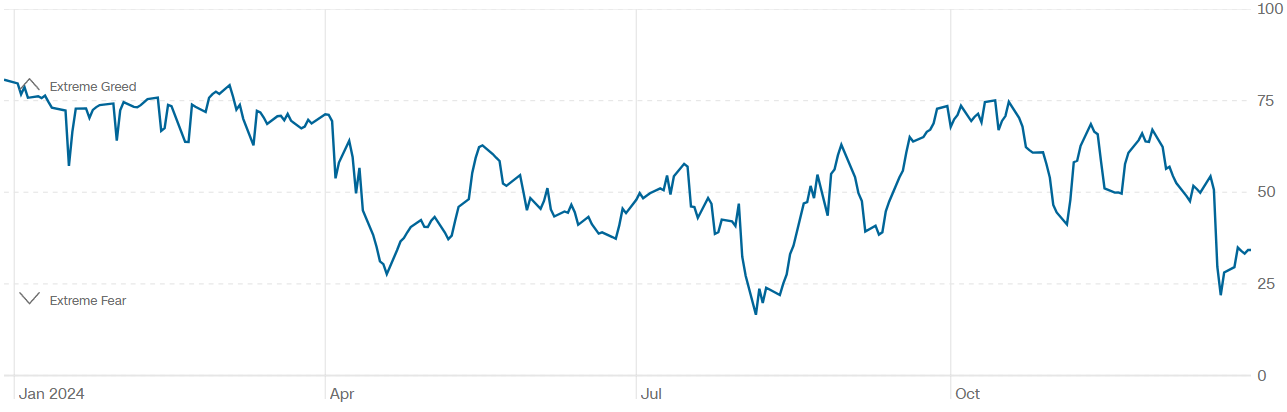 Il Fear&Greed Index sale a quota 34, mostrando ancora la paura come sentiment prevalente del mercato. Una settimana fa il valore era pari a 28.