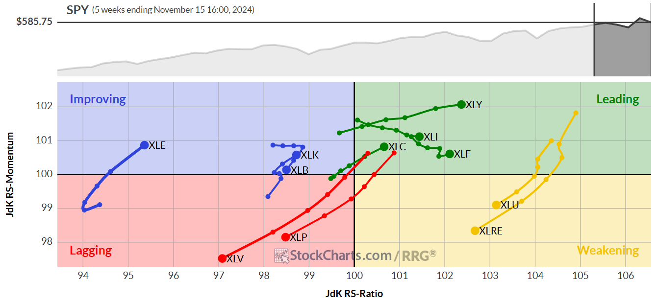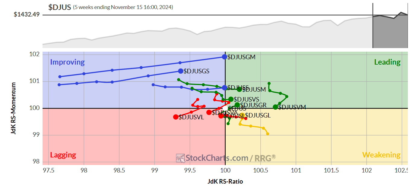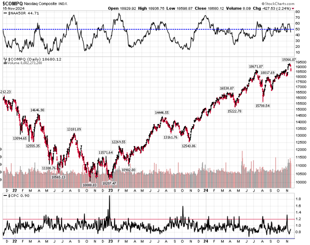 Il Dow Jones ha perso l’1,2%, mentre l’S&P 500 ha registrato un calo del 2,1% nella settimana. Il Nasdaq ha subito una contrazione del 3,15%, e il Russell 2000, è sceso del 4% affondato dalle vendite sulle small-cap. Il Nasdaq, l’S&P 500 e il Russell 2000 hanno perso i minimi della giornata di rialzo post-elettorale del 6 novembre. Inoltre, il Nasdaq è scivolato al di sotto della media mobile a 21 giorni. L’S&P 500 ha chiuso leggermente al di sotto dello stesso livello, mentre il Russell 2000 è riuscito a mantenersi sopra il supporto.