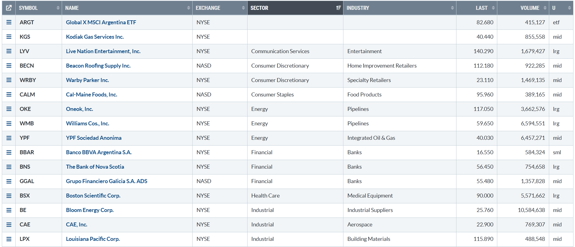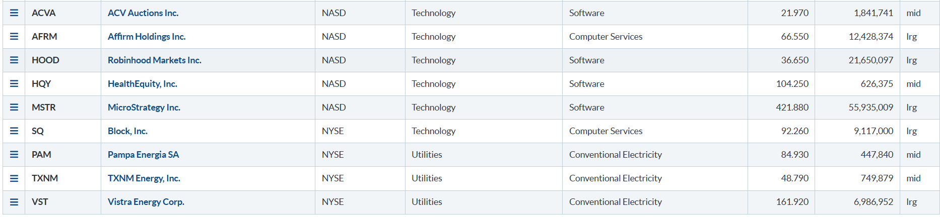 Di seguito i titoli che hanno creato un nuovo massimo a 52 settimane. Presenza di fintech, Argentina e bitcoin, mentre mancano le megacap.