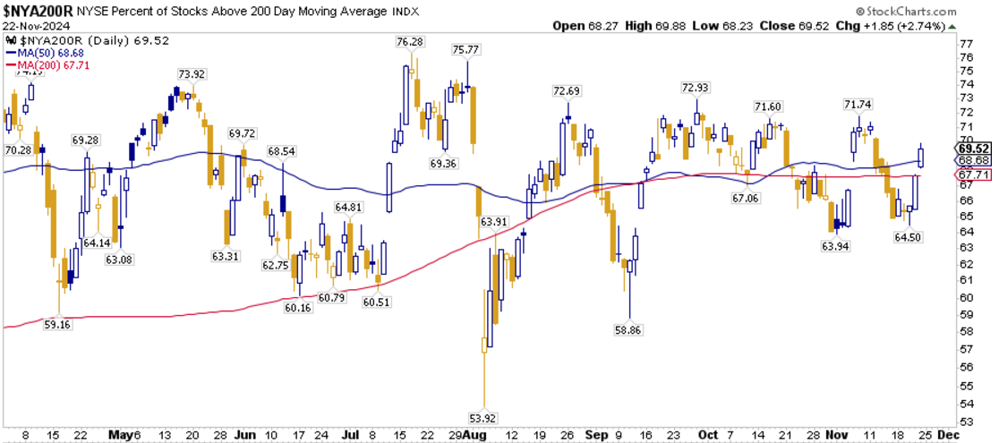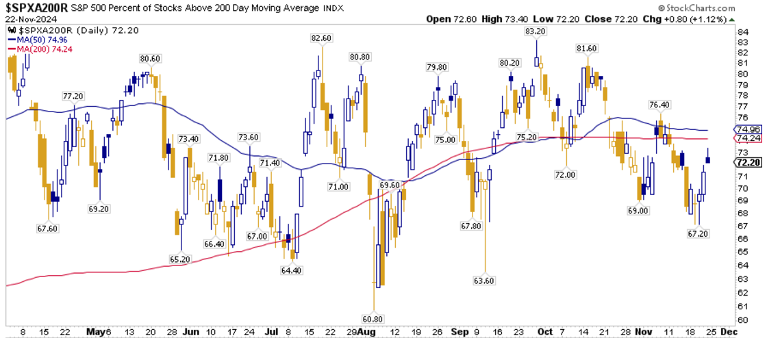 La percentuale dei titoli S&P500 scambiati sopra la loro media mobile a 200 periodi è pari al 72,20%, sul Nasdaq100 il 65,00% dei titoli prezza sopra lo stesso indicatore, mentre sul NYSE la percentuale è pari al 69,52%.