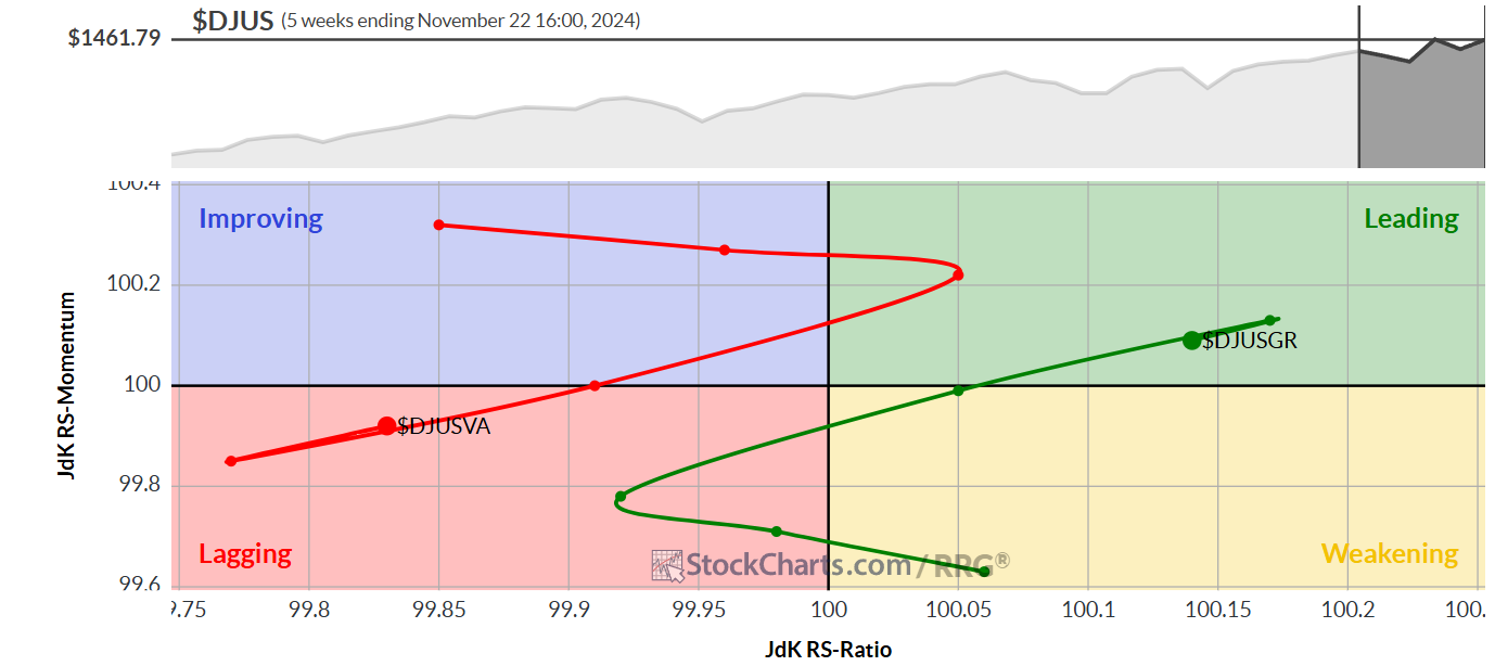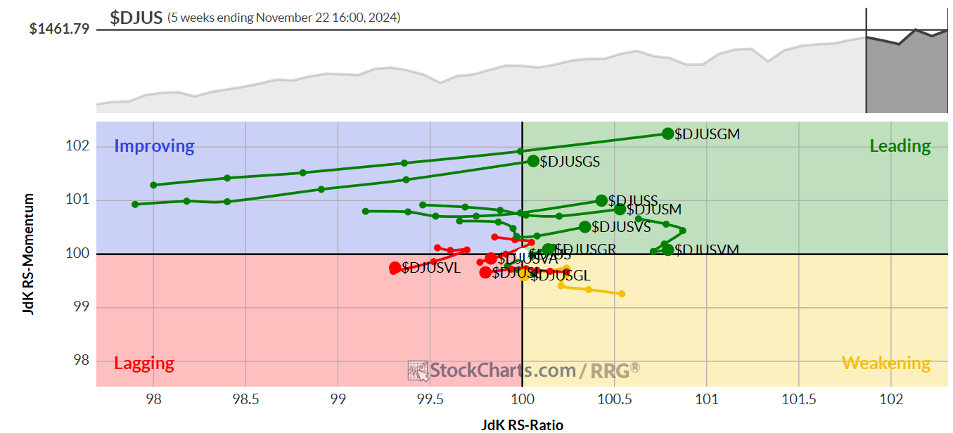 Il Dow Jones ha registrato un incremento di quasi il 2% nella scorsa settimana, raggiungendo un nuovo record di chiusura venerdì. Parallelamente, l’S&P 500 e il Nasdaq hanno guadagnato rispettivamente l’1,7%, mentre il Russell 2000 è salito del 4,5%. Tutti hanno testato ripetutamente le loro medie mobili a 21 giorni nel corso della settimana, rimbalzando da quei livelli. Il Nasdaq, pur trovando resistenza intorno alla soglia dei 19.000 punti, rimane vicino sia alla media mobile a 21 giorni sia ai massimi raggiunti nel periodo post-elettorale.