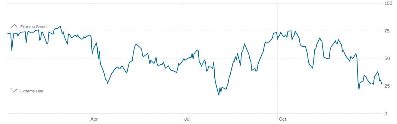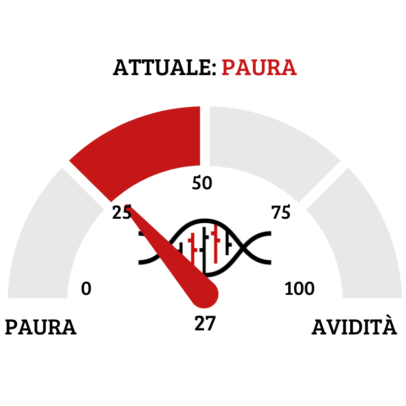 Il Fear&Greed Index scende a quota 27, mostrando ancora la paura come sentiment prevalente del mercato. Una settimana fa il valore era pari a 32.