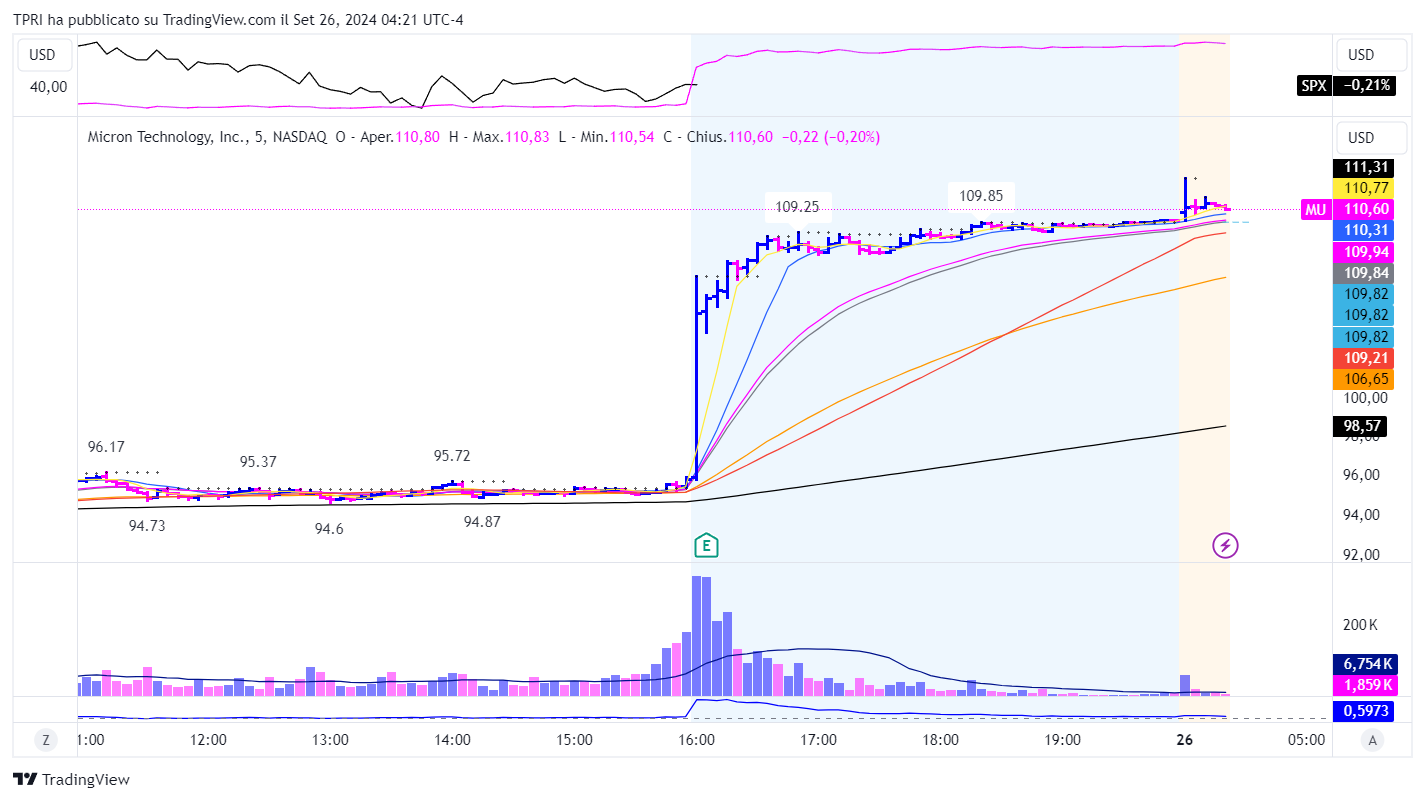 Dopo la sessione mista di ieri, futures del Dow Jones sono saliti leggermente durante la notte, insieme a quelli dell’S&P500 e del Nasdaq. Micron Technology (MU) è balzata grazie alla trimestrale, un segnale rialzista per i semiconduttori e per le azioni legate all’intelligenza artificiale. Anche i nuovi stimoli dalla Cina hanno continuato a sostenere i tori.