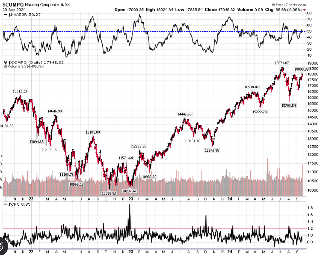 Il Nasdaq e il Russell2000 sono ora decisamente al di sopra delle loro medie mobili a 50 giorni. Entrambi hanno superato i loro massimi a breve termine di fine agosto giovedì, ma hanno chiuso la settimana appena sotto quei livelli. Il Nasdaq è anche tornato sotto la soglia dei 18.000 punti.