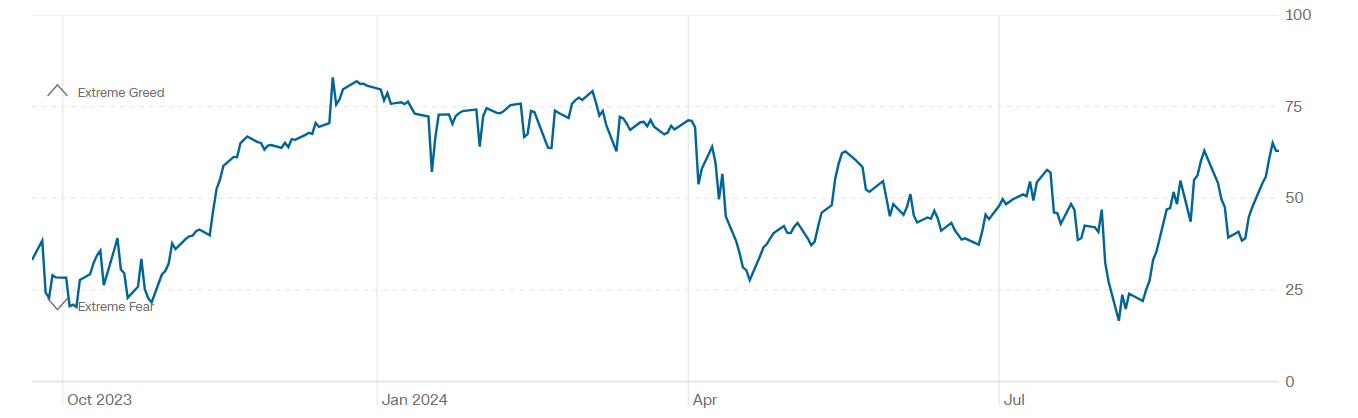 Il Fear&Greed Index sale a quota 63, indicando l’avidità come il sentiment prevalente. Una settimana fa il valore era pari a 49.