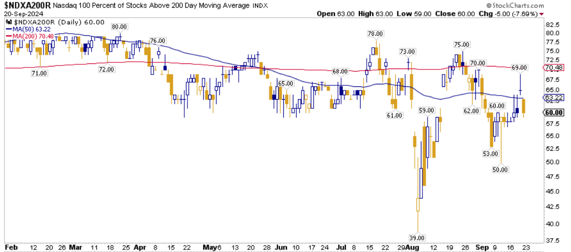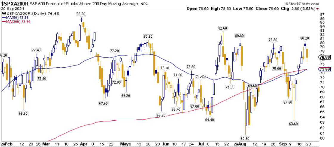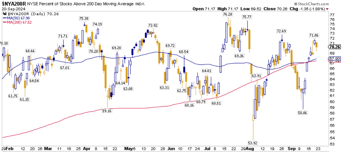 La percentuale dei titoli S&P500 scambiati sopra la loro media mobile a 200 periodi è pari al 76,60%, sul Nasdaq100 il 60,00% dei titoli prezza sopra lo stesso indicatore, mentre sul NYSE la percentuale è pari al 70,26%