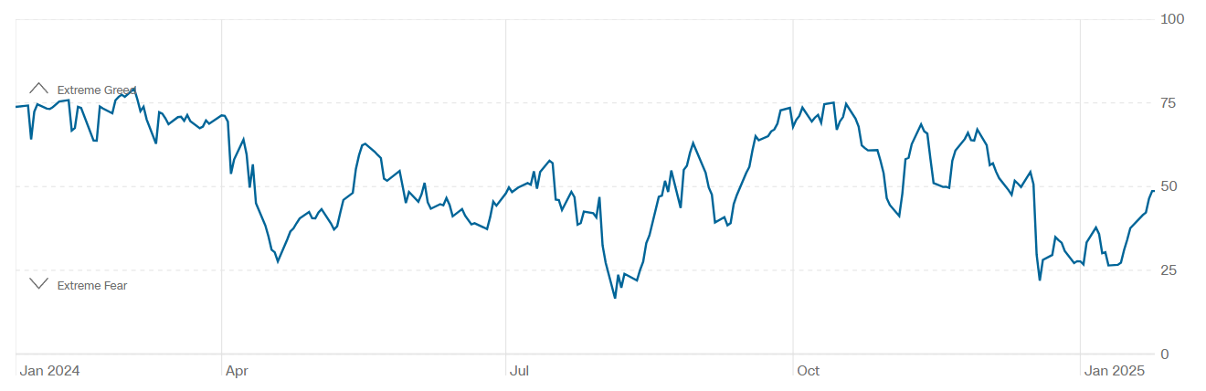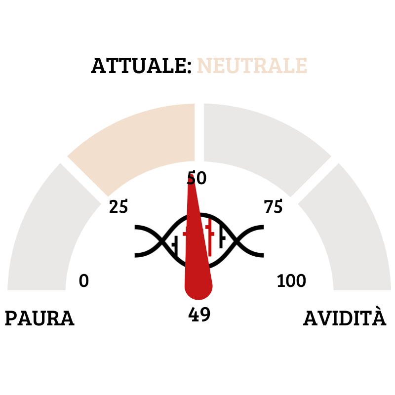 Il Fear&Greed Index sale a quota 49, mostrando la neutralità come sentiment prevalente del mercato. Una settimana fa il valore era pari a 38. Abbiamo assistito ad uno shakeout a livello di sentiment dalla pubblicazione degli ultimi NFP fino all’insediamento di Trump.