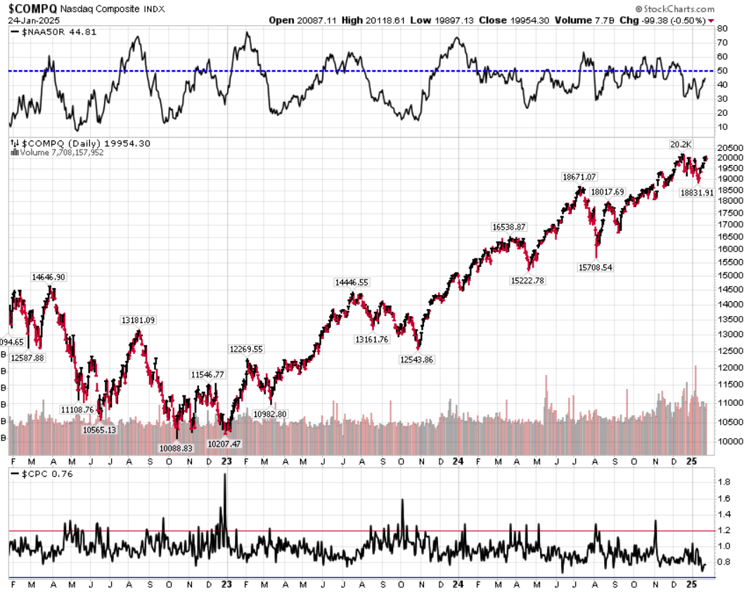 Divergenza $NAAR50 vs $COMP: sale la percentuale di titoli che prezzano sopra la SMA50 rispetto alla settimana precedente, in convergenza con la price action positiva dell’indice.