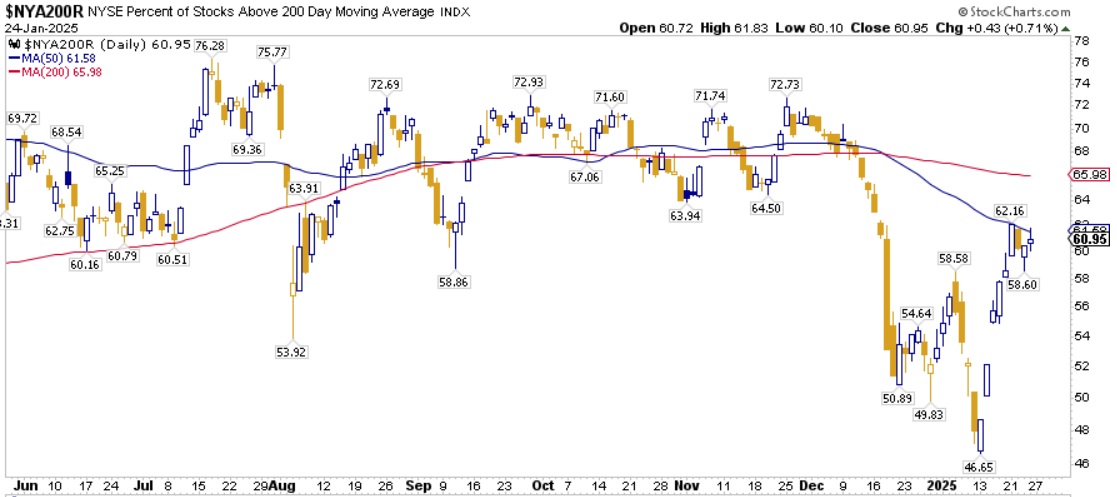 La percentuale dei titoli S&P500 scambiati sopra la loro media mobile a 200 periodi è pari al 61,80%, sul Nasdaq100 il 61,00% dei titoli prezza sopra lo stesso indicatore, mentre sul NYSE la percentuale è pari al 60,95%.