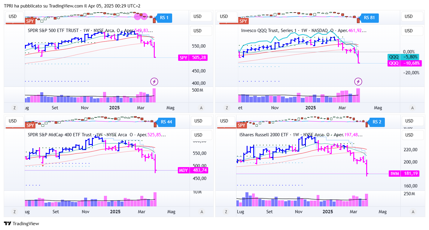 Il Dow Jones  ha registrato una perdita settimanale del 7,5%, raggiungendo il minimo degli ultimi otto mesi e cedendo ben 3.910 punti solo tra giovedì e venerdì. L’S&P 500 è sceso del 9,1%, mentre il Nasdaq ha perso il 10%, segnando entrambi i minimi degli ultimi undici mesi. Il Russell 2000, rappresentativo delle small-cap, ha subito una flessione del 9,7%, toccando il livello più basso dalla fine del 2023.