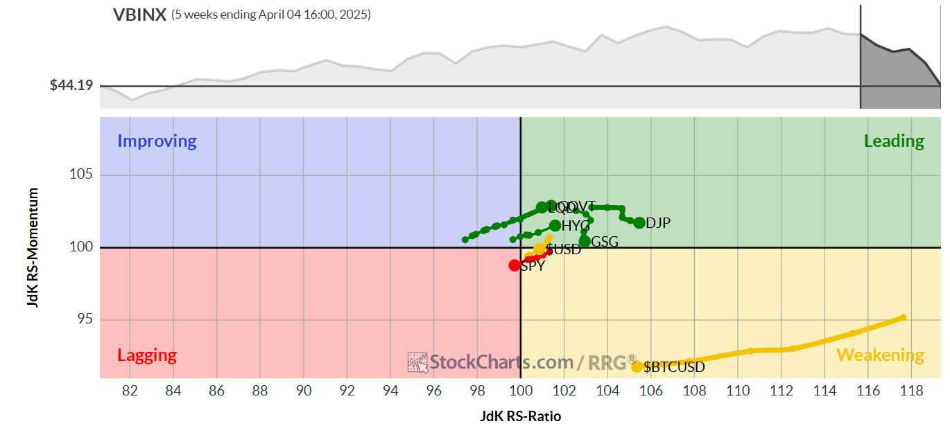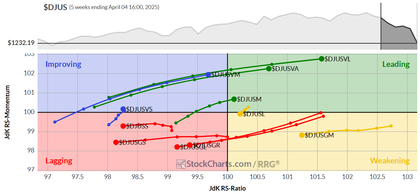 Sul versante opposto, solo due registrano traiettorie RRG negative, gli stessi della scorsa settimana. La tecnologia (XLK) si sta spingendo sempre più a fondo nel quadrante di ritardo, mentre il consumo discrezionale (XLY) si avvicina rapidamente a un passaggio dalla fase di indebolimento a quella di ritardo. Questa persistente debolezza in settori tradizionalmente dinamici merita attenzione, soprattutto perché coincide con la più generale fragilità del mercato.