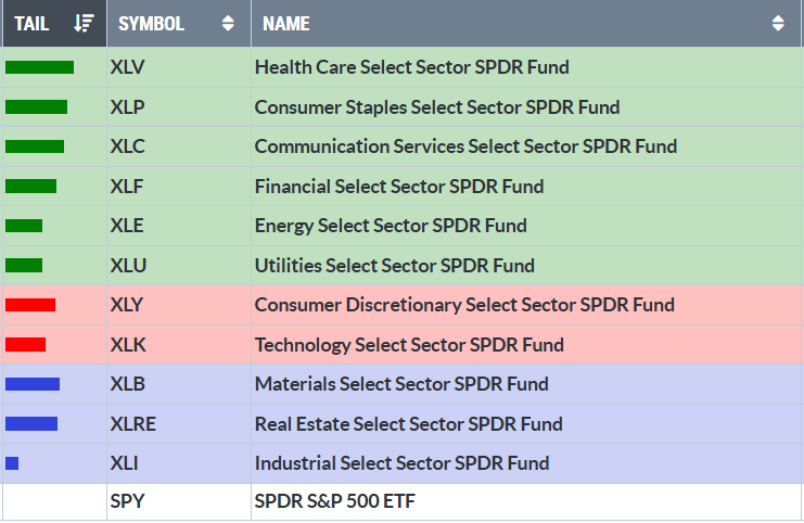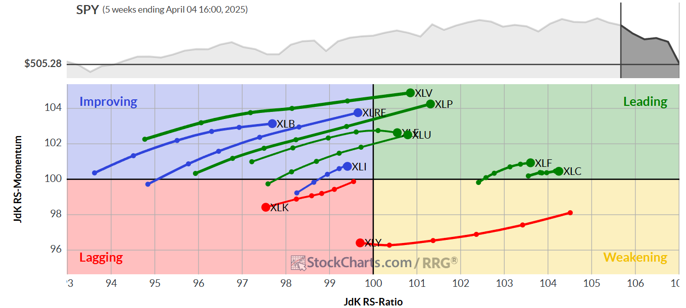 Il grafico settimanale di rotazione relativa evidenzia l’arrivo dei settori delle utilities (XLU) e della sanità (XLV) fra i leader.