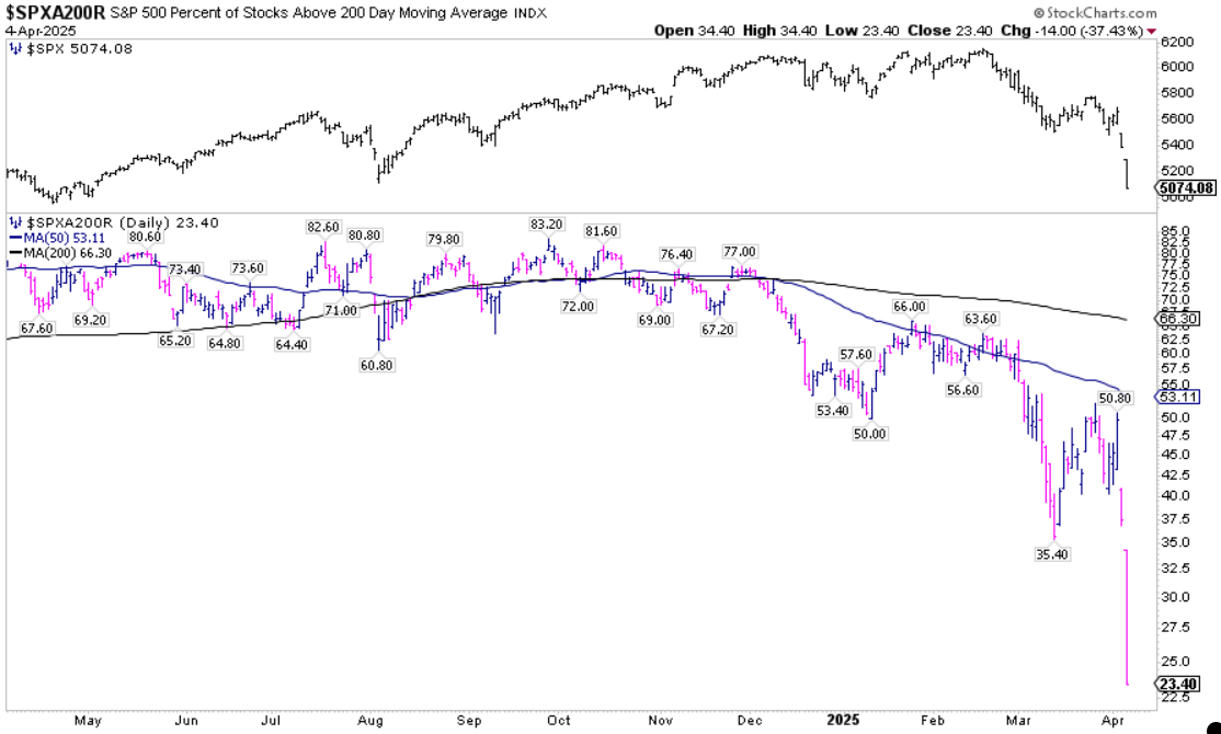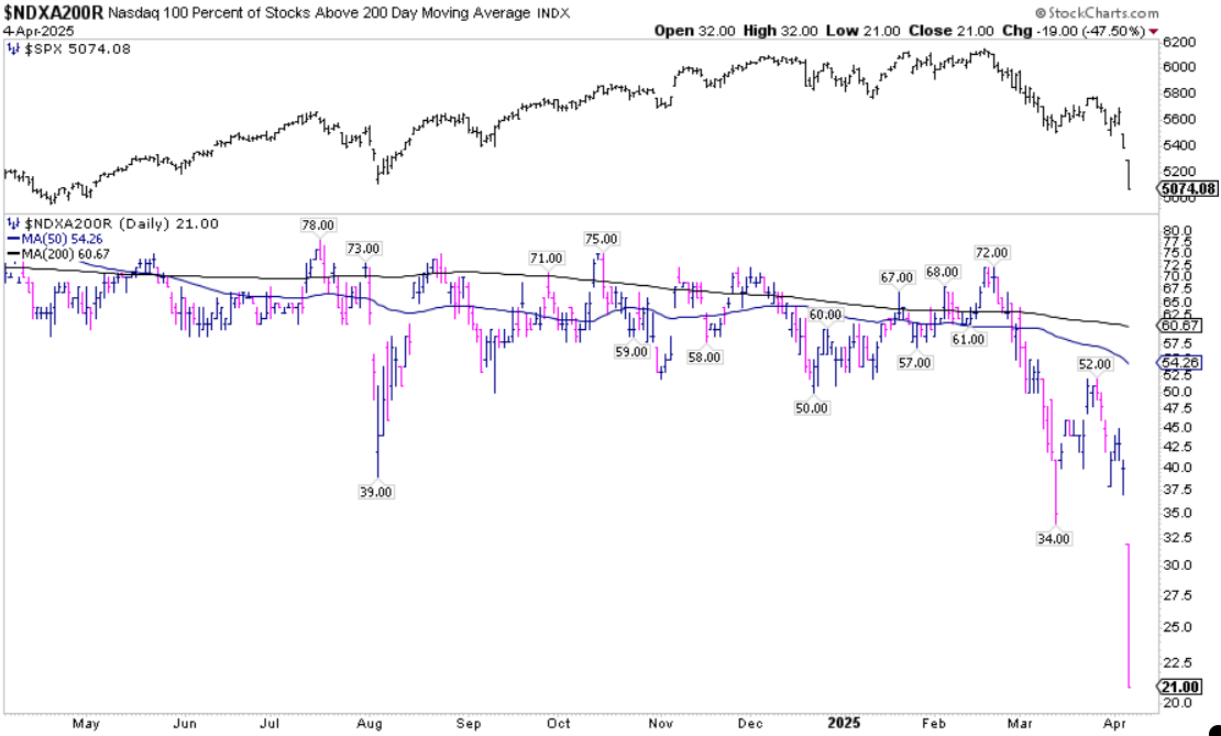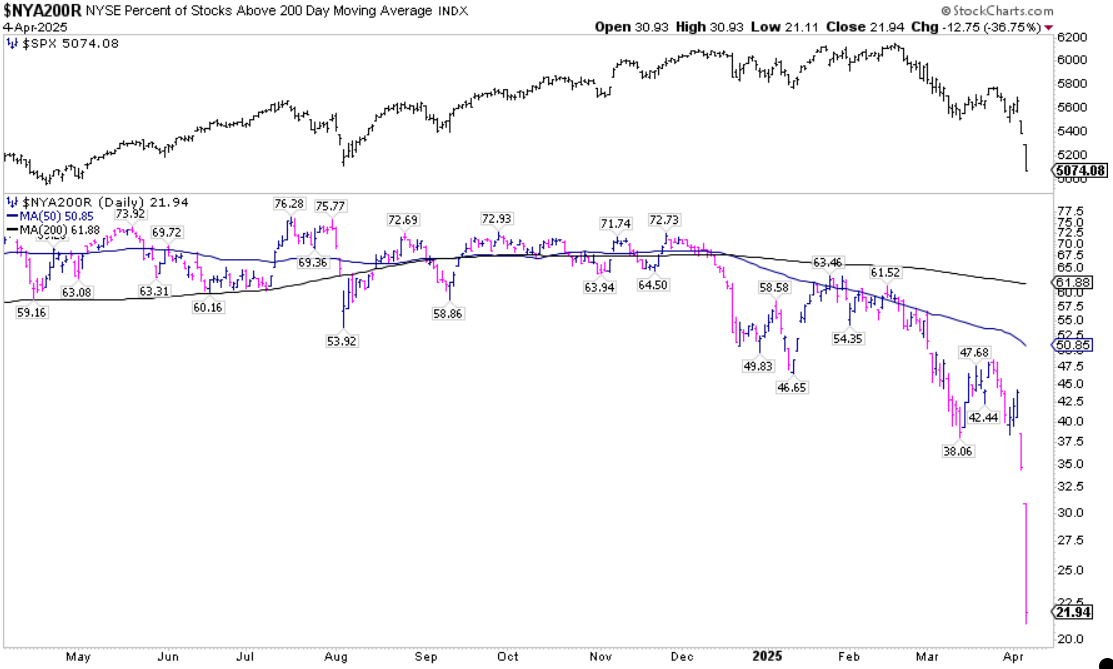 I grafici sottostanti riportano la percentuale attuale di titoli all’interno dell’S&P 500 (SPX), del Nasdaq 100 (NDX) e del Nyse (NYA) che si trovano sopra le rispettive medie mobili semplici a 200 giorni (SMA). Non sorprende probabilmente nessuno che il crollo delle azioni di  si sia tradotto in un peggioramento del breadth del mercato.