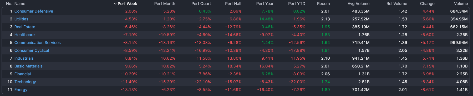 Tutti i settori dell’S&P 500 hanno chiuso la giornata di venerdì in territorio negativo: i comparti dell’energia, della finanza e dell’industria hanno subito i colpi più duri, mentre i settori della sanitario e real estate hanno mostrato una maggiore resilienza.