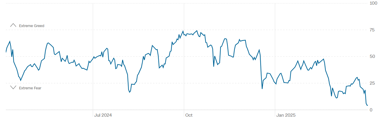 L’indice di volatilità CBOE, noto come VIX, è schizzato al livello più alto dall’agosto 2024, registrando persino la chiusura più elevata dal 2020. Questo indicatore della paura potrebbe suggerire che il mercato stia raggiungendo, almeno nel breve termine, un punto di minimo imminente.