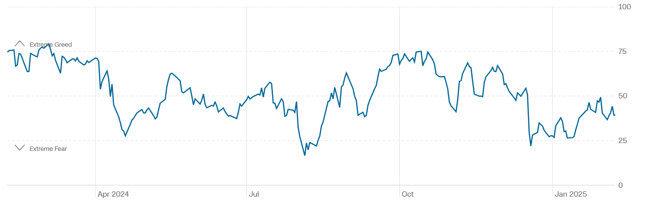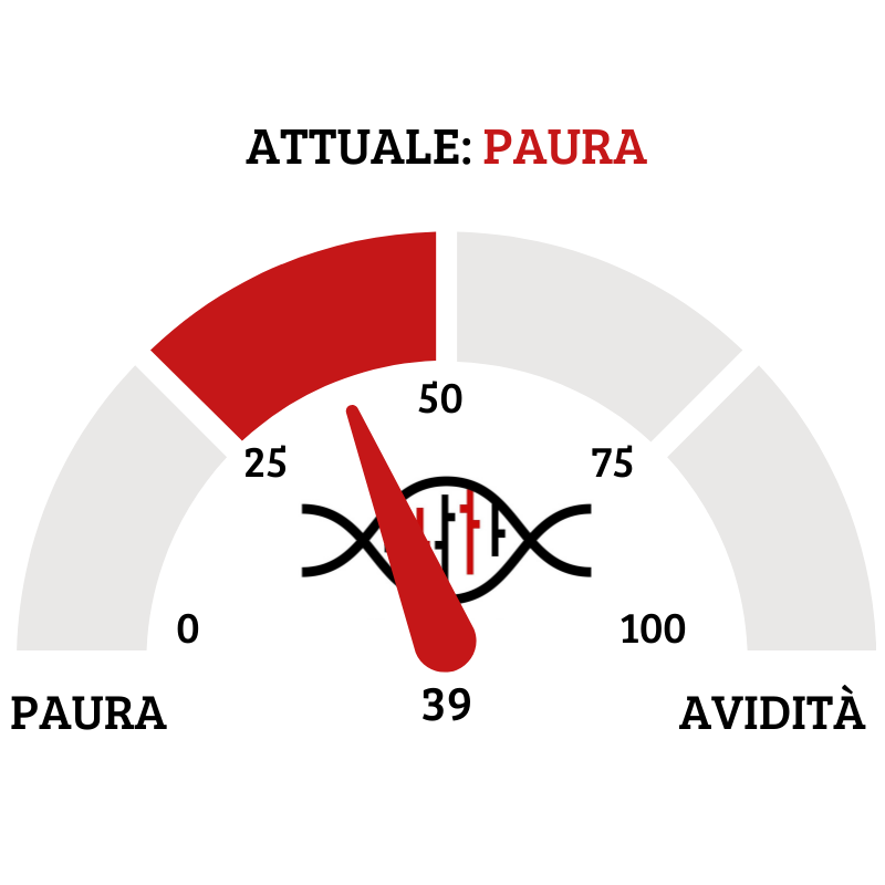 Il Fear&Greed Index scende a quota 39, mostrando ancora la paura come sentiment prevalente del mercato. Una settimana fa il valore era pari a 46.
