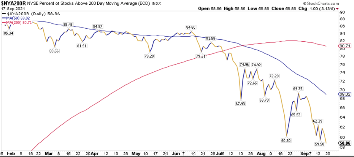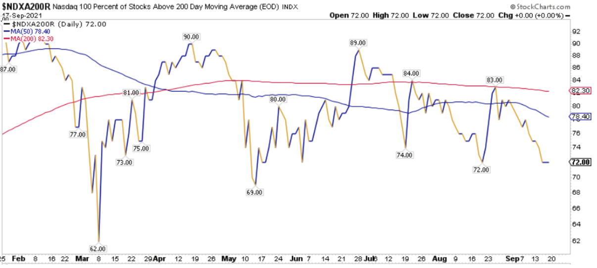 La percentuale dei titoli S&P500 scambiati sopra la loro media mobile a 200 periodi è pari al 71.74%, sul Nasdaq100 il 72.00% dei titoli prezza sopra lo stesso indicatore, mentre sul NYSE la percentuale è pari al 58.86%.