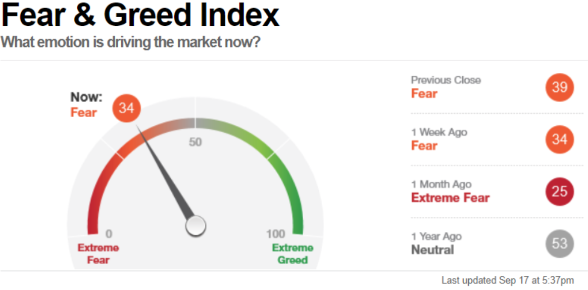 Il Fear&Greed Index rimane costante a quota 34, indicando la paura come sentiment prevalente. Una settimana fa il valore era pari a 34.