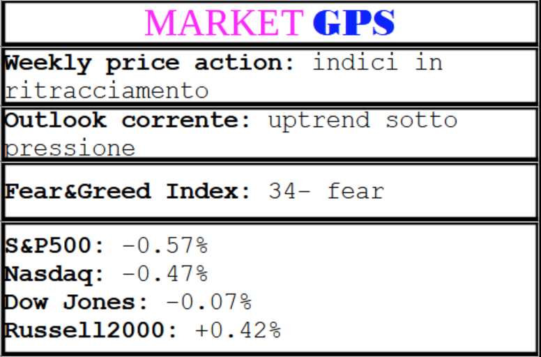 Mercoledì l’S&P500 aveva trovato supporto sulla SMA50D, come da attese, sfruttando il rimbalzo del mercato. Giovedì le perdite intraday sono state invece recuperate o ridotte in chiusura. Venerdì indice nuovamente sotto la SMA50D.