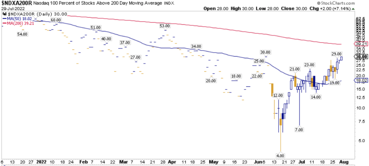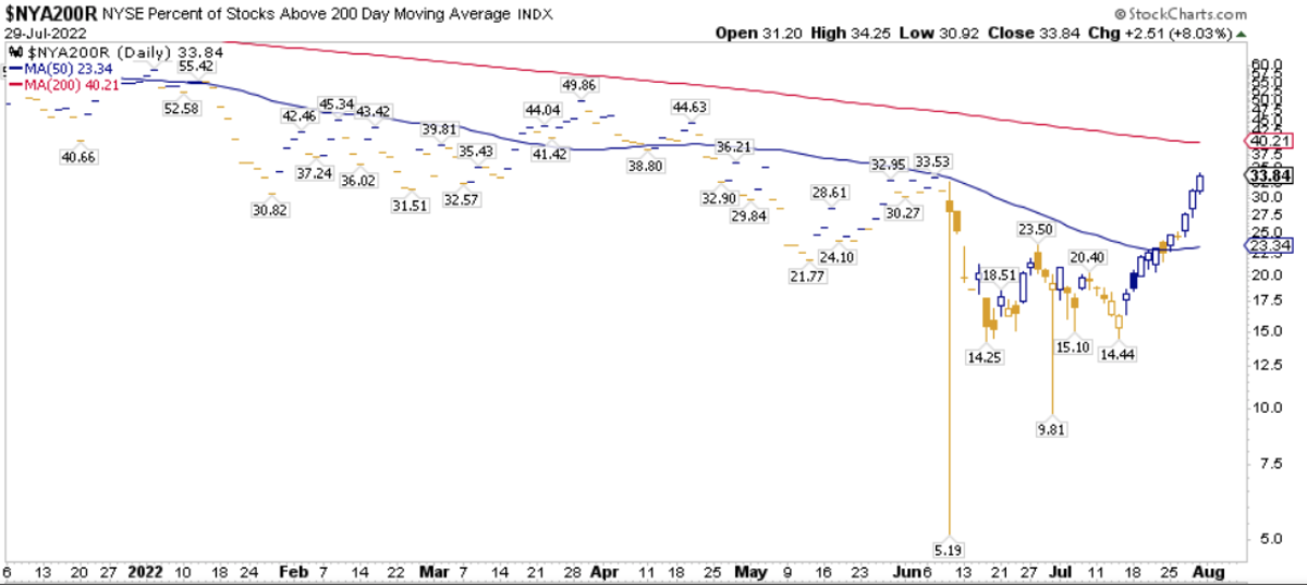 La percentuale dei titoli S&P500 scambiati sopra la loro media mobile a 200 periodi è pari al 36.80%, sul Nasdaq100 il 30.00% dei titoli prezza sopra lo stesso indicatore, mentre sul NYSE la percentuale è pari al 33.84%.