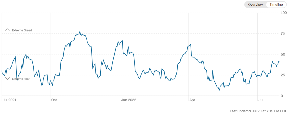 Il Fear&Greed Index sale a quota 42, indicando la paura come sentiment prevalente. Una settimana fa il valore era pari a 38.