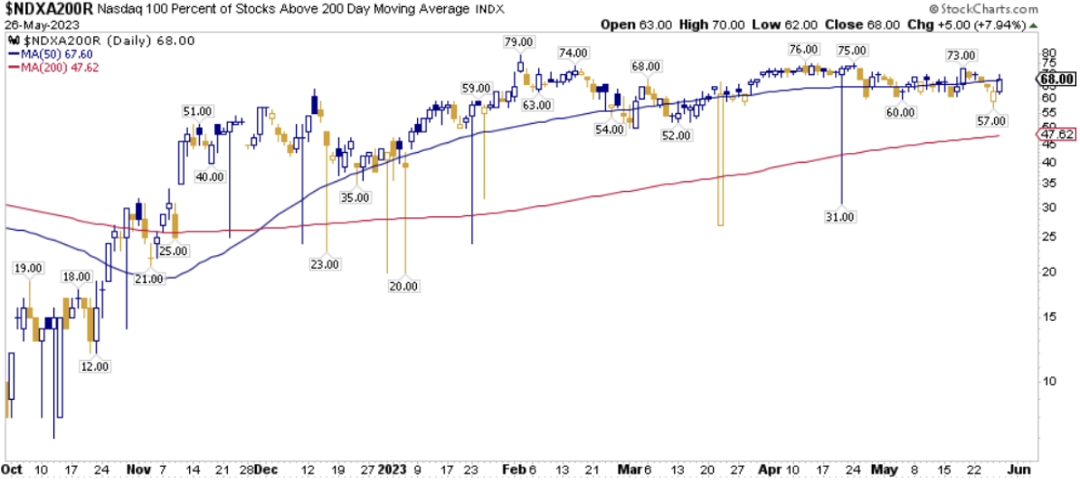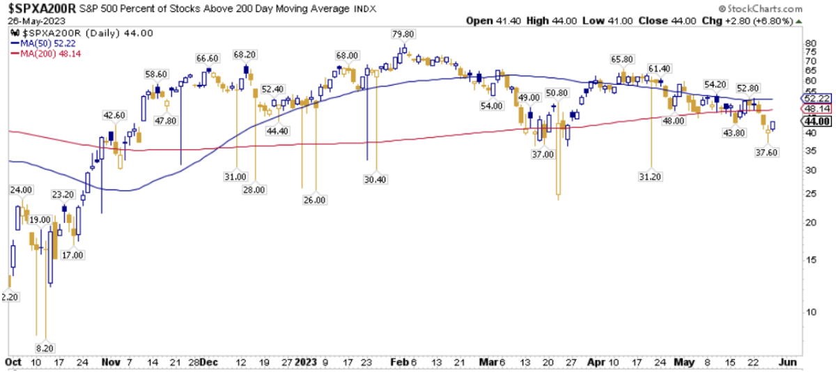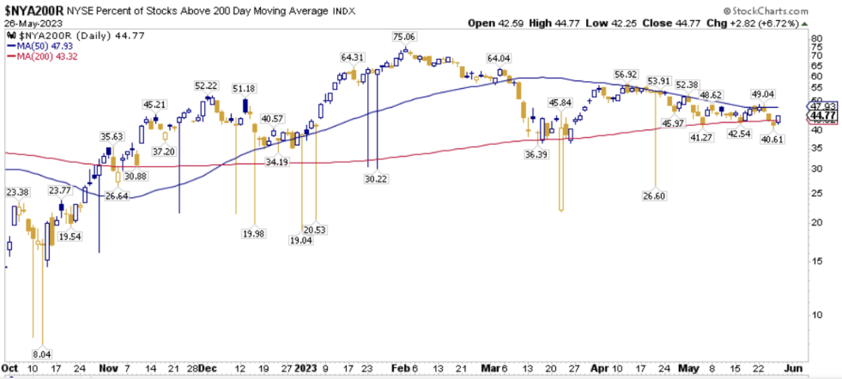 La percentuale dei titoli S&P500 scambiati sopra la loro media mobile a 200 periodi è pari al 44.00%, sul Nasdaq100 il 68.00% dei titoli prezza sopra lo stesso indicatore, mentre sul NYSE la percentuale è pari al 44.77%.