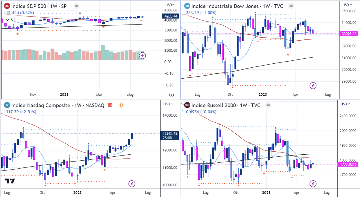 Ancora una volta sono il Nasdaq e il settore tecnologico più in generale a guidare il mercato, ampliando la divergenza con S&P500 e soprattutto Dow Jones e Russell2000.
