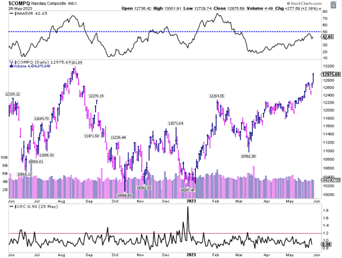 Divergenza $NAAR50 vs $COMP: diminuzione della percentuale di titoli che prezzano sopra la SMA50 rispetto alla settimana precedente, in divergenza con il rialzo dell’indice.